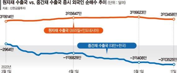 중간재 수출국(한국·대만)에서 외국인이 순매도한 만큼, 원자재 수출국(브라질·인도네시아)에서 순매수를 하고 있는 셈이다.