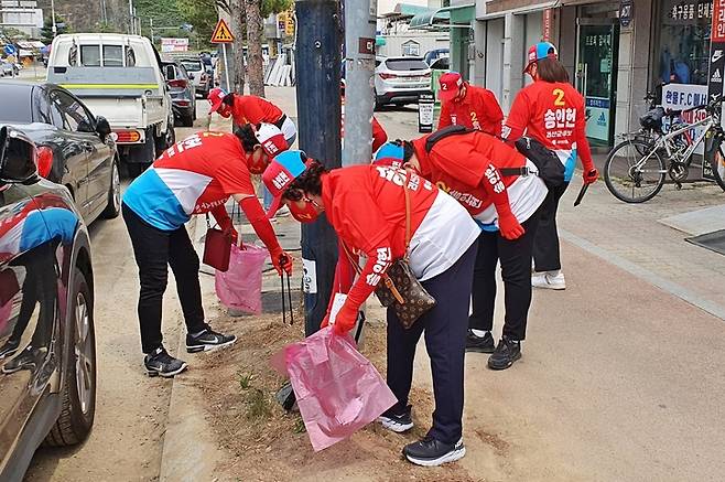 [괴산=뉴시스] 강신욱 기자 = 국민의힘 송인헌 충북 괴산군수 후보와 선거운동원들이 19일 괴산읍 일대에서 클린선거 캠페인으로 청소를 하고 있다. (사진=후보 캠프 제공) 2022.05.19. photo@newsis.com