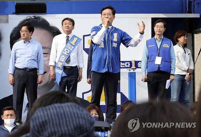 (서울=연합뉴스) 더불어민주당 송영길 서울시장 후보가 19일 오후 서울 노원역 인근에서 열린 집중유세에서 지지를 호소하고 있다. 2022.5.19 [국회사진기자단]