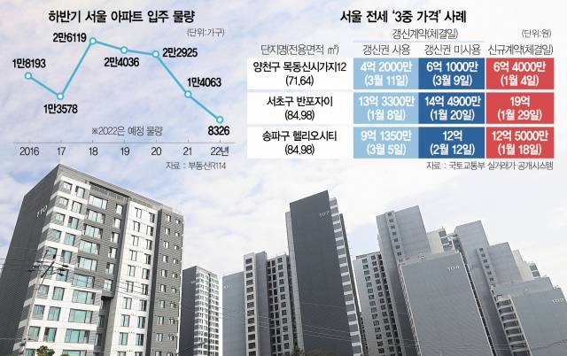부동산R114가 집계한 올해 하반기 서울 아파트 입주 물량(예정 포함)은 8326가구로 2016년 상반기 이후 6년 6개월 내 최저치다. 그간 주거 수요가 높은 서울에서 신축 아파트 입주 물량은 전세 시장의 과열을 막아주는 역할을 해왔다. 그러나 올해 하반기에는 달아오른 전세 시장을 식혀줄 물량마저 부족한 상황이다. 이 때문에 임대차 2법 시행 2년의 여파가 그대로 전세 시장을 휩쓸어버릴 수 있다는 우려가 나온다.