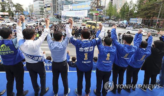 (서울=연합뉴스) 더불어민주당 송영길 서울시장 후보가 19일 오후 서울 노원역 인근에서 열린 집중유세에서 유권자들을 향해 인사하고 있다. 2022.5.19 [국회사진기자단]