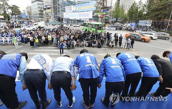 (서울=연합뉴스) 더불어민주당 송영길 서울시장 후보가 19일 오후 서울 노원역 인근에서 열린 집중유세에서 유권자들을 향해 인사하고 있다. 2022.5.19 [국회사진기자단]