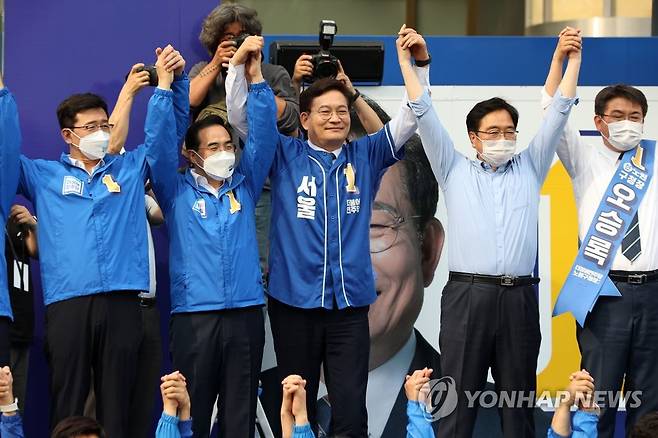 (서울=연합뉴스) 더불어민주당 송영길 서울시장 후보와 박홍근 원내대표가 19일 오후 서울 노원역 인근에서 열린 집중유세에서 유권자들을 향해 인사하고 있다. 2022.5.19 [국회사진기자단]