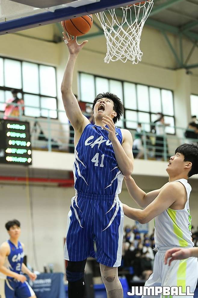 19일 중앙대 안성캠퍼스 체육관에서 열린 2022 KUSF 대학농구 U-리그 중앙대와 성균관대의 경기, 중앙대 정성훈이 골밑 득점을 올리고 있다.