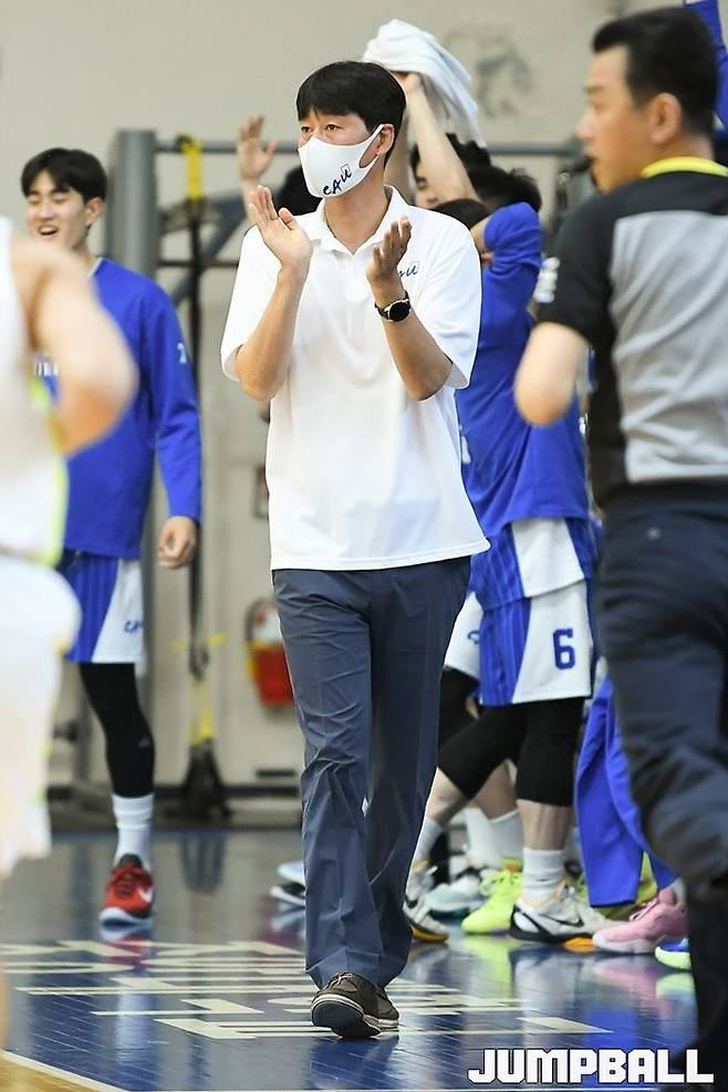 19일 중앙대 안성캠퍼스 체육관에서 열린 2022 KUSF 대학농구 U-리그 중앙대와 성균관대의 경기, 중앙대 양형석 감독이 선수들의 플레이에 만족감을 표하고 있다.