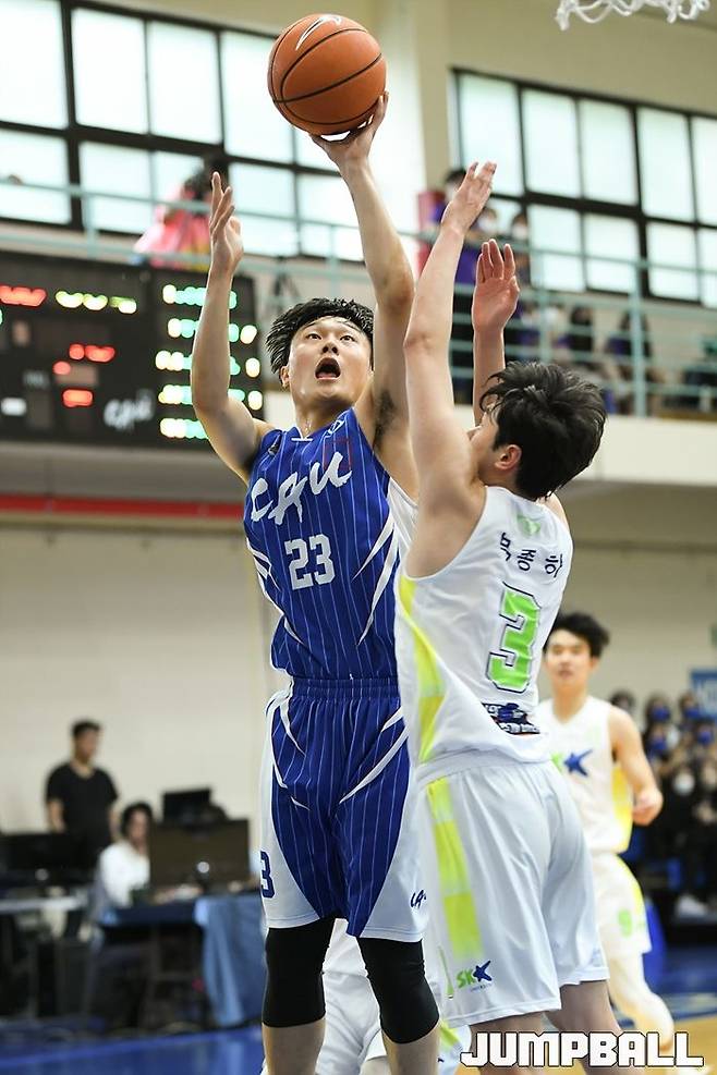 19일 중앙대 안성캠퍼스 체육관에서 열린 2022 KUSF 대학농구 U-리그 중앙대와 성균관대의 경기, 중앙대 박인웅이 공격을 시도하고 있다.