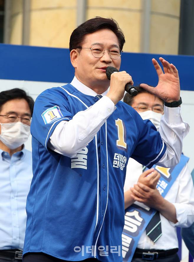 [이데일리 김태형 기자] 송영길 더불어민주당 서울시장 후보가 19일 오후 서울 노원구 롯데백화점 노원점 앞에서 열린 집중유세에서 유권자들에게 연설을 하고 있다.