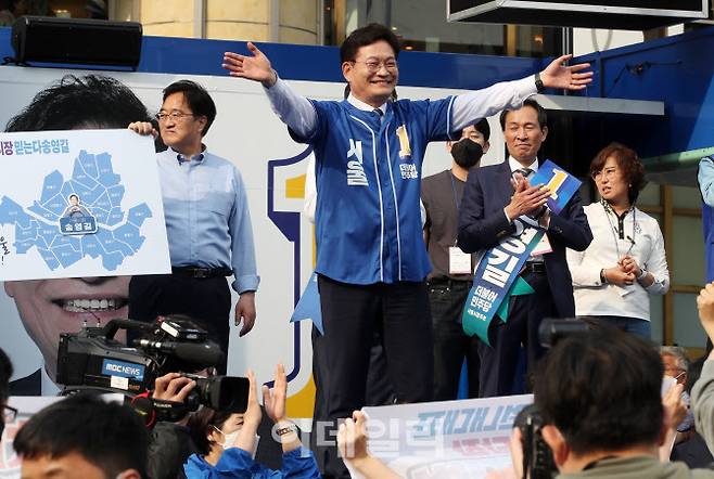 [이데일리 김태형 기자] 송영길 더불어민주당 서울시장 후보가 19일 오후 서울 노원구 롯데백화점 노원점 앞에서 열린 집중유세에서 유권자들에게 인사를 하고 있다.
