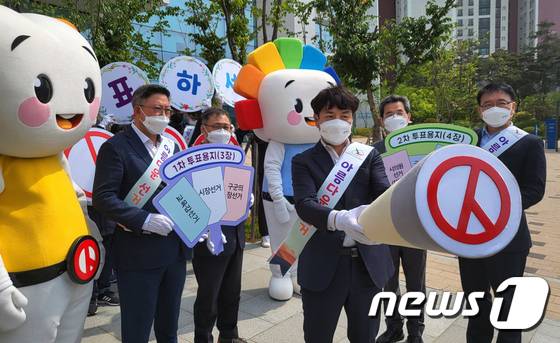 (인천=뉴스1) = 인천선거관리위원회 관계자들이 19일 오전 정부이천지방합동청사 정문광장에서 공명선거 다짐 캠페인을 하고 있다. (인천선거관리위원회 제공)2022.5.19/뉴스1
