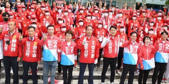 주기환 국민의힘 광주광역시장 후보는 공식 선거운동 첫날인 19일 광주역 광장에서 국민의힘 소속 구청장, 지방의원 후보들과 함께 출정식을 가졌다.