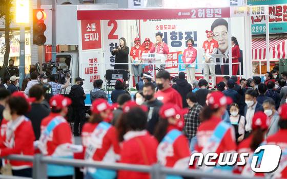 (제주=뉴스1) 오현지 기자 = 국민의힘 허향진 제주도지사 후보가 19일 오후 제주시청 앞에서 열린 출정식에서 지지를 호소하고 있다. 2022.5.19/뉴스1