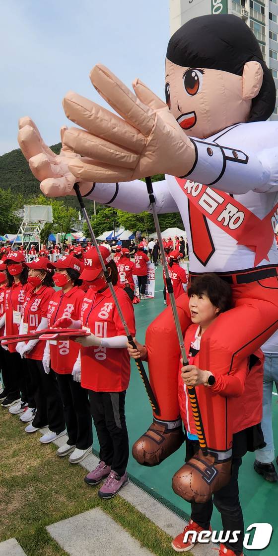 (구미=뉴스1) 정우용 기자 = 지방선거 공식선거운동 첫날인 19일 경북 구미 구평시장에서 열린 국민의힘 구미을 발대식에서 장미경 구미시의원 후보가 대형 풍선 인형을 메고 지지를 호소하고 있다. 2022.5.19/뉴스1