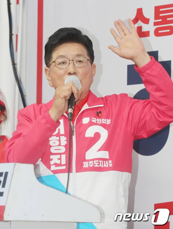 (제주=뉴스1) 오현지 기자 = 국민의힘 허향진 제주도지사 후보가 19일 오후 제주시청 앞에서 열린 출정식에서 지지를 호소하고 있다. 2022.5.19/뉴스1