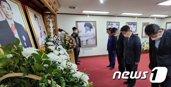 (구미=뉴스1) 정우용 기자 = 지방선거 공식선거운동 첫날인 19일 이철우 국민의힘 경북지사 후보가 김장호 구미시장 후보, 김영식 의원, 김관용 전 경북지사 등과 함께 구미 박정희 생가를 찾아 박 전 대통령 부부 영전에 헌화한 후 예를 올리고 있다. 2022.5.19/뉴스1