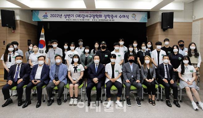 노현송(앞줄 왼쪽 다섯번째) 강서구청장이 19일 강서평생학습관에서 열린 '(재)강서구장학회 장학증서 수여식'에 참석해 장학생들과 기념촬영을 하고 있다.