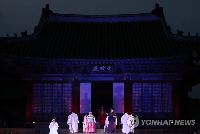 (서울=연합뉴스) 신준희 기자 = 19일 창경궁에서 궁중문화축전 고궁뮤지컬 '소현'에 출연하는 배우들이 드레스 리허설을 하고 있다. 2022.5.19