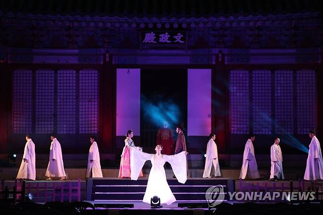 (서울=연합뉴스) 신준희 기자 = 19일 창경궁에서 궁중문화축전 고궁뮤지컬 '소현'에 출연하는 배우들이 드레스 리허설을 하고 있다. 2022.5.19