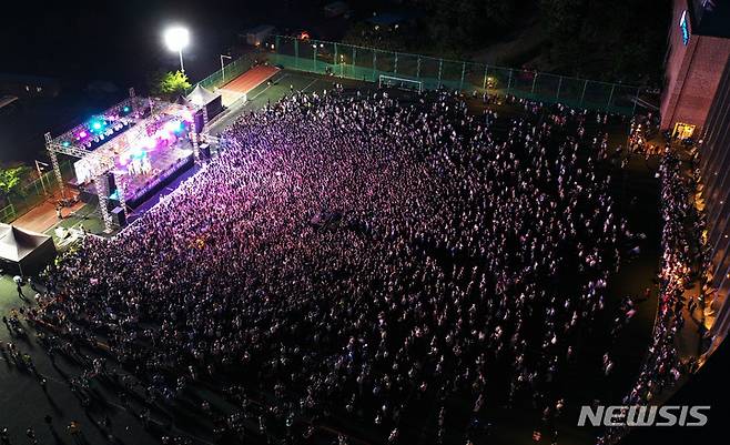 [용인=뉴시스] 백동현 기자 = 19일 밤 경기 용인시 한국외국어대학교 글로벌캠퍼스에서 가수 싸이가 공연을 하고 있다. 2022.05.19. livertrent@newsis.com