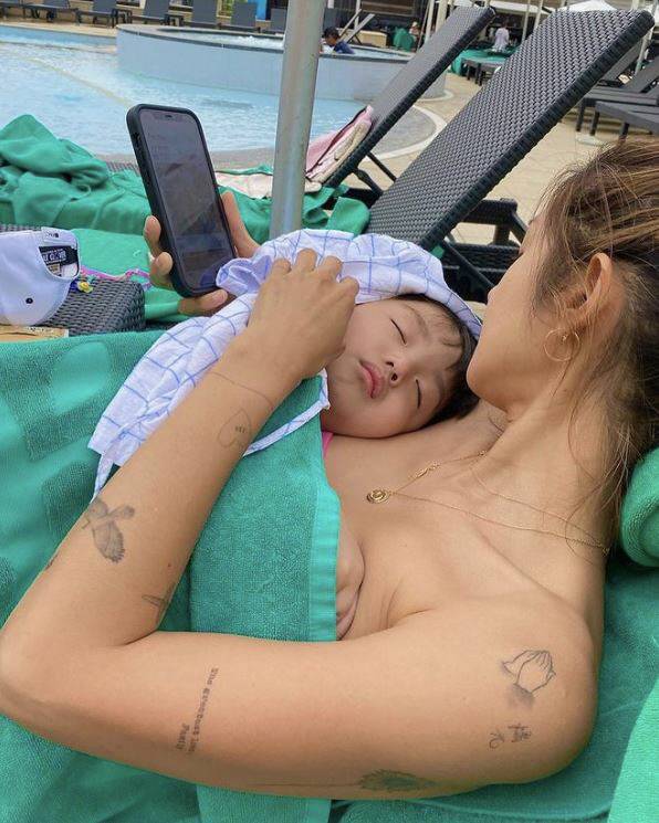 공개된 사진 속 김빈우는 가족과 수영장 나들이를 떠난 분위기. 곤히 잠든 아들을 케어하고 있어 눈길을 끈다. 특히 팔에 다양한 타투가 자리해 이 또한 시선을 끌었다.