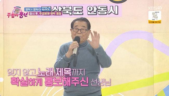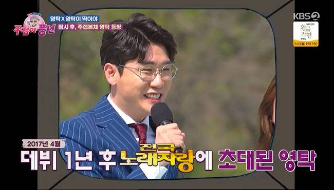 19일에 방송된 KBS2TV '팬심자랑대회 주접이 풍년'에서는 가수 영탁이 '전국노래자랑'의 MC 송해에게 감사한 마음을 전했다.