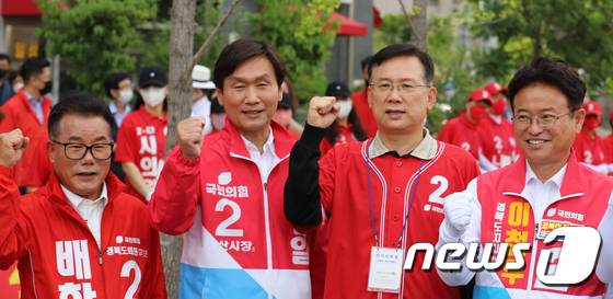 (구미=뉴스1) 정우용 기자 = 6·1지방선거 공식 선거운동 첫날일 19일 국민의힘 이철우 경북지사 후보가 조현일 경산시장 후보 지원 유세에서 조 후보와 함께 화이팅을 외치고 있다. (조현일 캠프 제공)2022.5.19/뉴스1