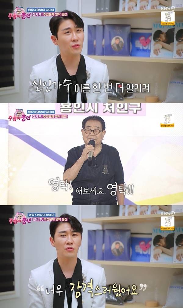 19일 방송된 KBS2 예능프로그램 '팬심자랑대회 주접이 풍년 (이하 '주접이 풍년')에서는 트로트 가수 영탁이 국내 최장수 MC 송해 덕분에 가수가 되었다는 사연을 전했다.