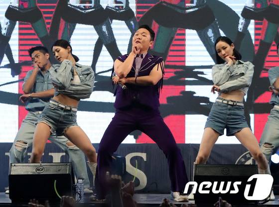 (용인=뉴스1) 김영운 기자 = 19일 오후 경기 용인 처인구 한국외국어대학교 글로벌캠퍼스에서 3년만에 열린 대동제에서 가수 싸이가 공연을 하고 있다. 2022.5.19/뉴스1