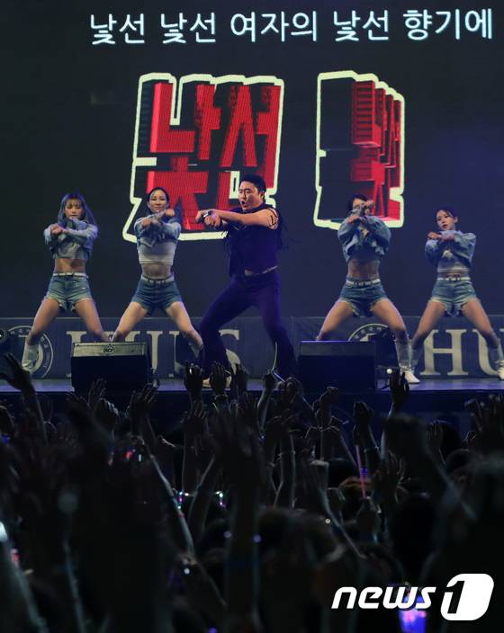 (용인=뉴스1) 김영운 기자 = 19일 오후 경기 용인 처인구 한국외국어대학교 글로벌캠퍼스에서 3년만에 열린 대동제에서 가수 싸이가 공연을 하고 있다. 2022.5.19/뉴스1