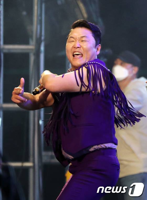 (용인=뉴스1) 김영운 기자 = 19일 오후 경기 용인 처인구 한국외국어대학교 글로벌캠퍼스에서 3년만에 열린 대동제에서 가수 싸이가 공연을 하고 있다. 2022.5.19/뉴스1
