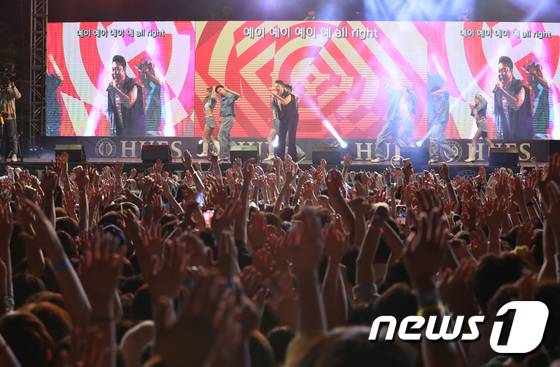 (용인=뉴스1) 김영운 기자 = 19일 오후 경기 용인 처인구 한국외국어대학교 글로벌캠퍼스에서 3년만에 열린 대동제에서 가수 싸이가 공연을 하고 있다. 2022.5.19/뉴스1