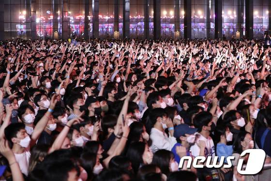 (용인=뉴스1) 김영운 기자 = 19일 오후 경기 용인 처인구 한국외국어대학교 글로벌캠퍼스에서 3년만에 열린 대동제에서 학생들이 가수 싸이의 공연을 즐기고 있다. 2022.5.19/뉴스1
