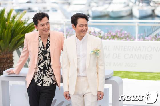 (칸=뉴스1) 이준성 프리랜서기자 = 배우 정우성・이정재가 19일 오후(현지시간) 프랑스 남부 칸 ‘팔레 데 페스티벌’(Palais des Festivals)에서 열린 제75회 칸 국제영화제에 미드나잇 스크리닝 부문에 초청된 영화 '헌트'로 포토콜 행사가 열려 포즈를 취하고 있다. 2022.5.19/뉴스1