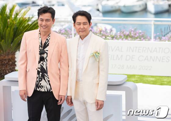 (칸=뉴스1) 이준성 프리랜서기자 = 배우 정우성・이정재가 19일 오후(현지시간) 프랑스 남부 칸 ‘팔레 데 페스티벌’(Palais des Festivals)에서 열린 제75회 칸 국제영화제에 미드나잇 스크리닝 부문에 초청된 영화 '헌트'로 포토콜 행사가 열려 포즈를 취하고 있다. 2022.5.19/뉴스1