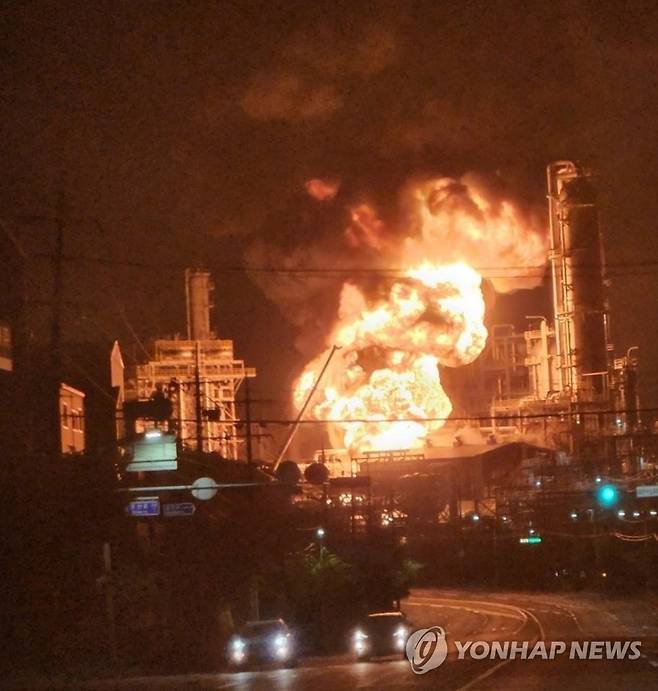 (울산=연합뉴스) 19일 오후 울산시 울주군 온산읍 에쓰오일 공장에서 대형 화재가 발생해 불기둥이 치솟고 있다. 2022.5.19 [독자 제공. 재판매 및 DB 금지]