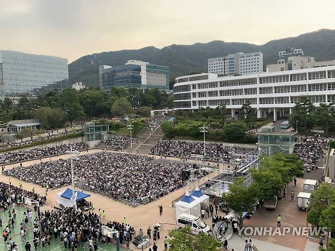 (부산=연합뉴스) 부산대 대동제 마지막 날인 19일 오후 인기그룹 '위너'와 가수 거미 초청공연을 앞두고 '넉넉한 터'가 인파로 가득 차 있다. 부산대 총학생회는 앞서 17일 코로나19로 중단됐던 축제를 4년 만에 열었다. 부산대 측은 아직 코로나19 상황이 끝나지 않은 점을 고려해 본 무대 객석을 제한하고 의자 간 거리 두기를 실시했다. 2022.5.19 [부산대 제공. 재판매 및 DB 금지]