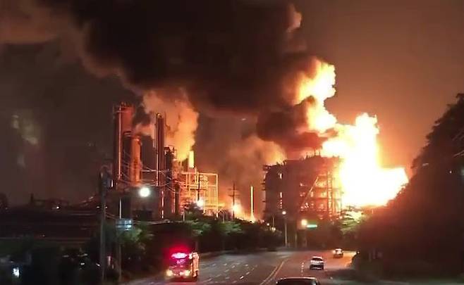 [서울=뉴시스] 19일 울산시 울주군 에쓰오일 온산공장에서 폭발·화재 사고가 발생해 불길이 치솟고 있다. 소방당국은 대응 1단계를 발령해 진화 작업을 벌이고 있다.(사진=독자 제공 영상 캡쳐) 2022.05.19. photo@newsis.com *재판매 및 DB 금지