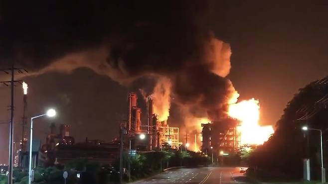 [서울=뉴시스] 19일 울산시 울주군 에쓰오일 온산공장에서 폭발·화재 사고가 발생해 불길이 치솟고 있다. 소방당국은 대응 1단계를 발령해 진화 작업을 벌이고 있다.(사진=독자 제공 영상 캡쳐) 2022.05.19. photo@newsis.com *재판매 및 DB 금지