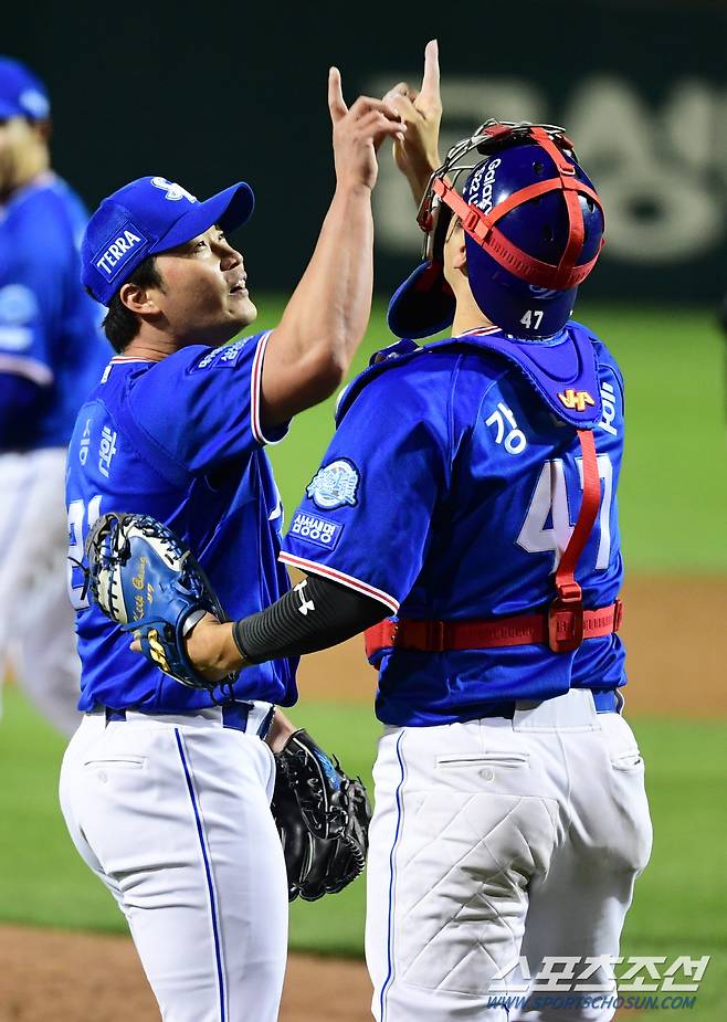 2022 KBO리그 한화이글스와 삼성라이온즈의 경기가 19일 대전한화생명이글스 파크에서 열렸다. 삼성 오승환이 팀의 2대1 승리를 확정짓가 강민호와 환호하고 있다. 대전=최문영 기자 deer@sportschosun.com/2022.05.19/