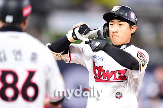 [마이데일리 = 수원 곽경훈 기자] KT 유준규가 19일 오후 경기도 수원 KT위즈파크에서 진행된 '2022 신한은행 SOL KBO 리그' LG-KT의 경기 4회말 2사 1루에서 LG 임찬규를 상대로 데뷔 첫 안타를 때린 뒤 세리머니를 펼치고 있다.- ⓒ마이데일리(www.mydaily.co.kr). 무단전재&재배포 금지 -