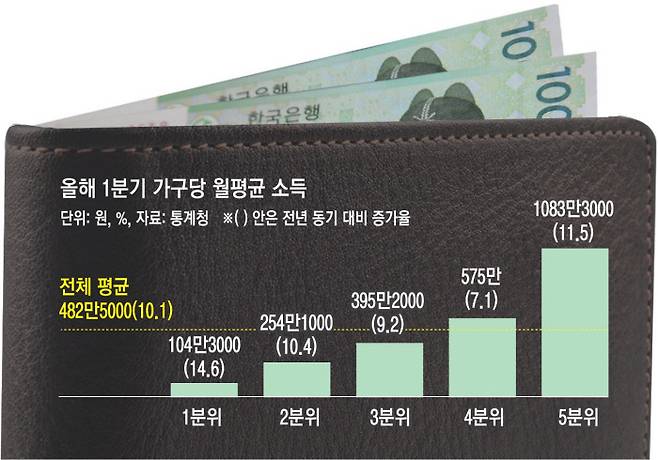 소득분위별로 보면 1분위(하위 20%)의 소득 증가율이 가장 높았다. 월평균 104만3000원으로 1년 전보다 14.6% 늘었다. 임시직 취업자가 늘면서 근로소득이 큰 폭(34.2%)으로 개선된 데다 공적·기초연금 확대로 공적이전소득(15.9%)이 증가한 영향이다. 공적이전소득의 분위별 소득 증가 기여도는 1분위에서 가장 높았다. 2분위와 3분위, 4분위의 소득 증가율은 각각 10.4%, 9.2%, 4.4%였다. 상위 20%인 5분위의 월평균 소득은 1083만3000원으로 11.5% 증가했다.