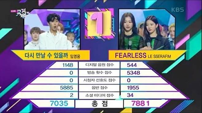 이를 두고 논란이 불거졌다. ‘뮤직뱅크’는 디지털 음원 점수 60%, 방송 횟수 점수(이하 방송 점수) 20%, 시청자 선호도 점수 10%, 음반 점수 5%, 소셜 미디어 점수 5%를 합산한 총점으로 순위를 책정한다. 임영웅은 디지털 음원 점수와 음반 점수에서 르세라핌을 크게 앞섰으나, 방송 점수에서 0점을 기록하며 르세라핌(5348점)에 뒤처졌다. 방송 점수를 제외한 두 팀의 점수는 임영웅이 7035점, 르세라핌이 2533점이었다.