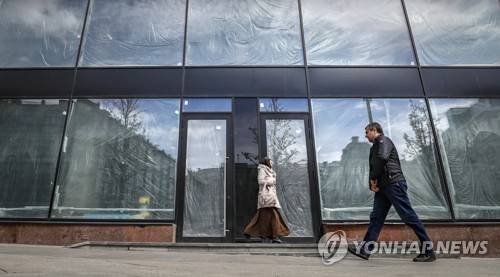 epa09957803 Russian people walk in front windows of empty commercial premises in Moscow, Russia 19 May 2022. As the result of sanctions imposed by the West on Russia, a number of international brands have announced the suspension or limitation of their business in Russia. EPA/YURI KOCHETKOV
