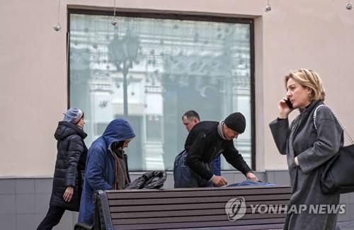 epa09957810 Russian people walk in front windows of empty commercial premises in Moscow, Russia 19 May 2022. As the result of sanctions imposed by the West on Russia, a number of international brands have announced the suspension or limitation of their business in Russia. EPA/YURI KOCHETKOV
