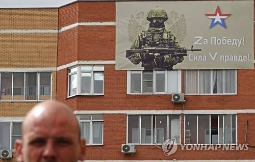 epa09957454 A view of a banner with the letters Z and V, in Moscow, Russia, 19 May 2022. The letters Z and V, painted on Russian military vehicles in Ukraine, have quickly become a symbol of support of the Russian army. On 24 February Russian troops had entered Ukrainian territory in what the Russian president declared a 'special military operation', resulting in fighting, and multiple sanctions against Russia. EPA/MAXIM SHIPENKOV