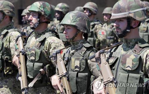 epa09957843 A Portuguese military service-woman (C), part of the Portuguese unit that is hosted at the 1st Instruction Battalion 'Olt' military base of the Romanian Army, stand with her weapon while waiting for the visit of Portuguese Prime Minister Antonio Costa (not pictured), in Caracal city, 200 Km west from Bucharest, Romania, 19 May 2022. Romanian President Klaus Iohannis and Portuguese Prime Minister Antonio Costa met Romanian and Portuguese military personnel from the NATO alliance deployed to Romania amid rising tensions at the Black-Sea region due to the Russian-Ukrainian conflict. EPA/ROBERT GHEMENT