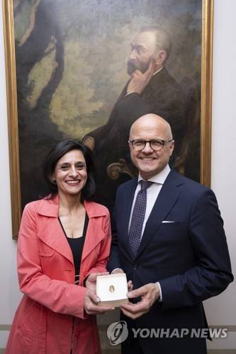 epa09957850 The Nobel Foundation's CEO Vidar Helgesen (R) returns a 3,000-year-old Mycenaean gold ring to Elena Vlachogianni, from the Greek Ministry of Culture, in Stockholm, Sweden, 19 May 2022. The ring was stolen from a museum in Rhodes during World War II and ended up via the United States with Nobel laureate Georg von Bekesy, who donated it to the Nobel Foundation at his death. EPA/Henrik Montgomery SWEDEN OUT