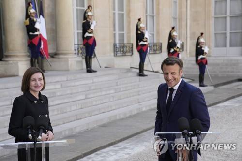 French President Emmanuel Macron, right, and Moldova's President Maia Sandu address reporters before their talks at the Elysee Palace, Thursday, May 19, 2022 in Paris.Macron expressed concerns about the risk of the conflict in Ukraine spreading to neighboring countries, including Moldova. (AP Photo/Christophe Ena)