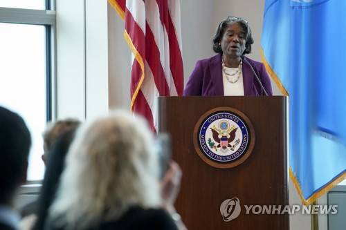Linda Thomas-Greenfield, U.S. ambassador to the United Nations, introduces U.S. Secretary of State Antony Blinken before a town hall at the U.S. Mission to the United Nations with members of staff, Thursday, May 19, 2022, in New York. (AP Photo/John Minchillo, Pool)