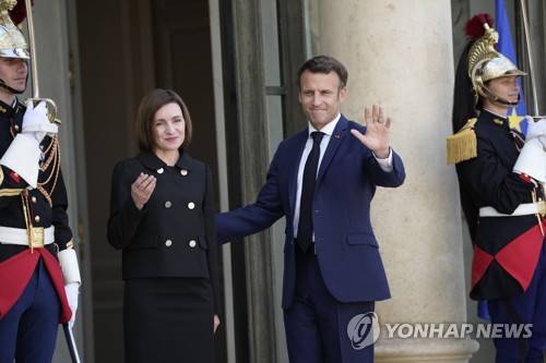 French President Emmanuel Macron, right, welcomes Moldova's President Maia Sandu before their talks at the Elysee Palace, Thursday, May 19, 2022 in Paris.Macron expressed concerns about the risk of the conflict in Ukraine spreading to neighboring countries, including Moldova. (AP Photo/Christophe Ena)