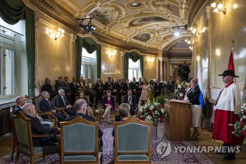 epa09957861 Slovak President Zuzana Caputova (2-R) holds her official speech in the Federal Palace, the Parliament Building, in Bern, Switzerland, 19 May 2022. Caputova is visting Switzerland for a two-day state visit. EPA/ANTHONY ANEX